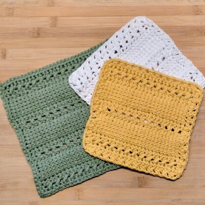 The Crossroads Clusters Washcloth is an advanced beginner crochet pattern that features the linked tunisian simple stitch, the double crochet crossed stitch and the half double crochet clusters stitch.