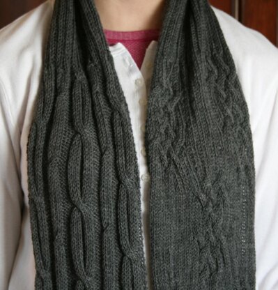 This scarf is knit from end to end, but in 3 sections, Section A is a variation of the Crossroads stitch pattern, Section B is k2p2 ribbing, and Section C is a Country Lanes cable pattern. Because of the uniqueness of the 3 sections, the knitter can decide how to make the scarf: Sections A, B & C, or Sections A, B & A, or Sections C, B & C. So the pattern is really 3 patterns in 1. All will use the same yardage.