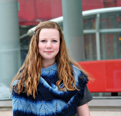 This shawl features the same diamond and crest motifs found in the Fannette Island Cowl, but is worked in a lovely crescent shape to drape around the shoulders and curve gently when worn. It is worked with large-ish needles and worsted weight yarn, so it’s a quick knit. Schoppel Wolle Gradient’s stunning colorway inspired this piece, though it can certainly be worked in a tonal or solid.
