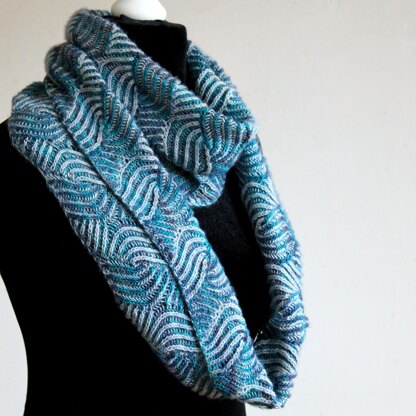 Meaning swirl or vortex in Scottish Gaelic, Cuairteagan is a syncopated brioche cowl which blends and twists two different colours together in a faux cable. Inspired by flowing water, I picked blue and silver as my colours. Pick contrasting colours for a dramatic cowl, or different shades of the same colour for a more subtle cowl, the choice is up to you! The inside of the cowl is the inverse of the outside and is just as pretty so you can wear the cowl either way round or fold the top over to show off both sides at once.