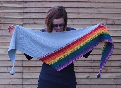 Cuar (Irish for 'curve) is a biased garter stitch triangular shawl. The shawl begins at a point, and is increased as you work. Cuar features rainbow stripes, worked in a combination of garter stitch and slipped stitch rows, for a gradual transition between colours. Cuar features pom pom rainbows for an extra little hint of fun!