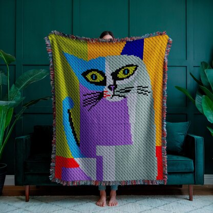 Celebrate artistic flair and feline charm with this Cubism-style Cat Portrait blanket, worked in the Corner-to-Corner (C2C) technique! This pixel-style design features dynamic lines and striking color blocks.