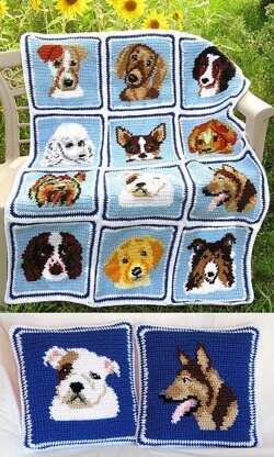 A dozen adorable puppy faces adorn this beautiful crocheted afghan and pillows. Pick your favorite pup to make your own pillow! Pupplies include: Jack Russell Terrier, Dachshund, Beagle, Poodle, Chihuahua, Golden Retriever, Yorkie, Bulldog, German Shepherd, English Springer Spaniel, Golden Lab and Collie.