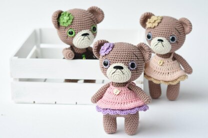 - Safety eyes (Ø 18 mm) DK weight yarn is used for the teddy, sport yarn for the dress and flower.