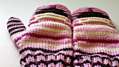 Many illusion knitting patterns use only two colours, but I’ve designed these convertible flip-top mittens with stripes of four colours so you will see a full-colour cupcake, complete with cherry on top.