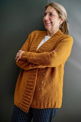 CURVATURE is a cozy yet elegant cardigan that, apropos of its name, is full of curved lines. Beginning with the drape of the front panels, curves are also used in the dart shaping on the back, giving the sweater a lovely shape regardless of whether it is worn buttoned or left open! Even the placement of the buttons are in a curved line!