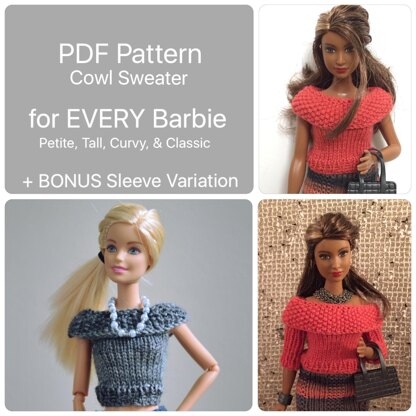 This knitting pattern is for a basic Knitted Cowl Sweater with variation to add sleeves. Includes instructions for ALL of Barbie's body types. The existing Body types are: Vintage, Silkstone, Athletic, Made-to-Move, and Classic. I will refer to all of the existing styles from now on as "Classic". That's because they vary only slightly, and one set of instructions will work for all "Classic" body styles. The new body styles recently added were, Petite, Tall, and Curvy.