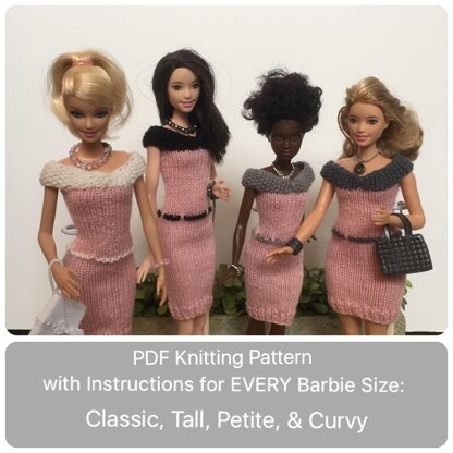 This is a knitting pattern for a dress with instructions for ALL of Barbie's body types. The existing Body types are: Vintage, Silkstone, Athletic, Made-to-Move, and Classic. I will refer to all of the existing styles from now on as "Classic". That's because they vary only slightly, and one set of instructions will work for all "Classic" body styles. The new body styles recently added were, Petite, Tall, and Curvy.