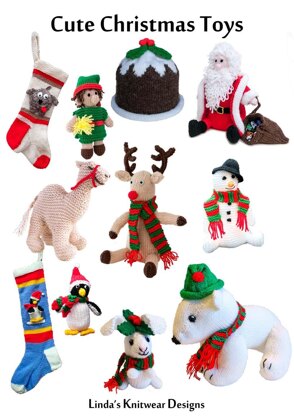 Cute Christmas Toys booklet includes the following patterns: Stanley Snowman toy - 9.5 inches tall Peter Penguin toy - 5 inches tall Polar Bear toy - 9.5 inches tall Father Christmas - 9.5 inches tall Rudolph Reindeer - 11.5 inches tall Reindeer Herder - 7.5 inches tall. Camel - 8 inches tall Christmas Rabbit - 9 inches tall Christmas Stocking with Robin or Penguin design Christmas Stocking for your dog Christmas Pudding hat to fit ages 4 to 8 years