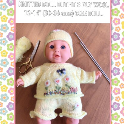 Cute doll outfit with embroidered smock, hat. and knickers . knitted in 3-4ply yarn, works well with paintbox yarn. 2.75 needles.Embroidery thread, dissolving plastic or interfacing.