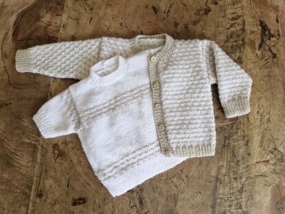Materials:Jacket: James C Brett Supreme Baby 4 ply: 1(2) x 100 g balls [440m/482yds] white [A] and 1(2) x 100 g balls in contrasting colour [B]; Jersey: 1(2) x 100 g balls in white [A] and 1(1) x 100 g ball in contrasting colour [B]; pair each 2¾mm, 3 mm and 3¼ mm needles; 5 small buttons for jacket; 3 small buttons for jersey; stitch holder.