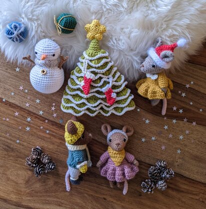 Crochet amigurumi pattern for this cute little mouse and its winter and Christmas accessories : hats, scarf, snood, boots, gloves, sweater, pants, dress, Christmas tree, snowman, Christmas presents, Christmas stockings. (33 pages PDF with written instructions and step-by-step pictures).