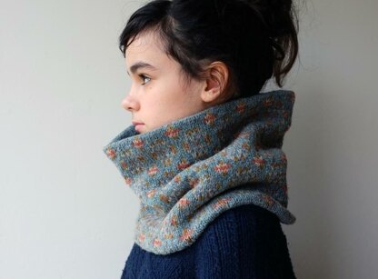 Da Capo is knitted in the round, like a long tube and folded in half to create a double-sided cowl, warm and that holds nicely around the neck. After a provisional cast-on, the soft and subtle fairisle is worked, it is the outside face. In keeping with it, the inner face is knitted. It is made up of stripes and has a slightly narrower circumference to allow the collar to properly surround the neck without sagging. This construction also gives nice finishings, since the floats are not visible, hidden inside. Once the “tube” is finished, it is folded inwards and stitches from cast-on and stitches from last row are assembled together using kitchener stitch.