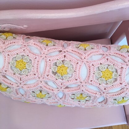 My Daisies for Days Pillow is inspired by the daisy garland that I named by crochet Instagram after! It is composed of eight rows of daisy hexagons. The join as you go method is used to join them. The pillow is seamed on the inside, so the joining seam is hidden inside of the pillow. Five buttons hold the pillow together, and allow it to be taken on and off of the pillow insert. There are pictures included throughout the pattern to demonstrate all of the steps! There is also a chart for the hexagons. I used Patons Grace cotton DK yarn, but any DK weight yarn will work. You will need one ball of the color of the centers of the flowers, two balls of the color of the petals of the flowers, and five balls of the background color. You will also need five buttons, and a 12 by 20 in pillow insert.