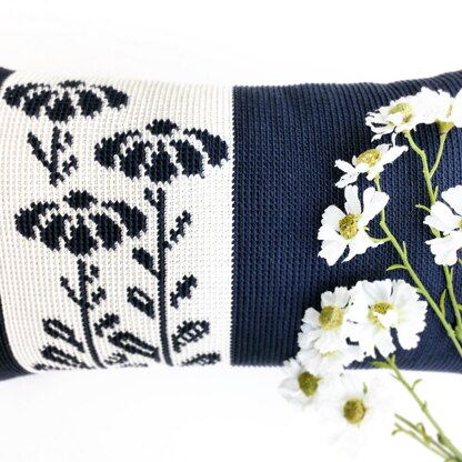 A fresh and contemporary tapestry crochet cushion inspired by traditional cross stitch. The daisy design is worked in two colours using double crochet in the round. The designs wraps both sides of the cushion and may be crocheted as a single panel or three repeat panels to cover the whole cushion.