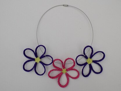 Colourful pretty daisies. There are many possibilities to use these flowers (decoration, appliqué, pendant...), you'll find some tips in my pattern instructions. I've decided to make a necklace, simple and nice, easy even for beginners. I've used the same material that for my flowery necklace and coral earrings creating this item. My new "invention" is simple but I'm satisfied with the result. Each flower keeps perfectly its shape what is due to this secret material everyone can have at home. I've used bright threads as YarnArt Bright polyamide (yellow green and pink) and Seam Enigma (purple) viscose but you can use other threads or yarns of the colour of your choice.