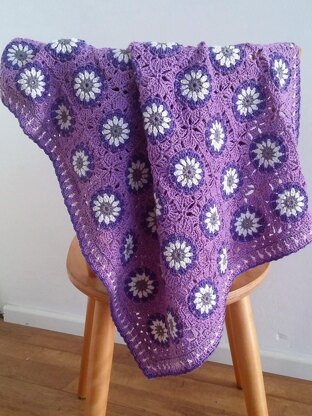 Sweet and cozy, this lovely floral blanket is perfect for the crib, car or stroller. Traditional granny squares with white daisies are made in beautiful shades of purple. Motifs are joined on last round as they are worked, using a join-as-you-go method.