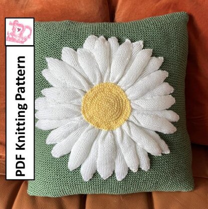 I designed and hand knit this 18"/45cm Daisy pillow cover used DK/light worsted/8ply weight yarn. Gauge is important for the cover itself, but you could use oddments of other yarns from your stash to make the petals and centre.
