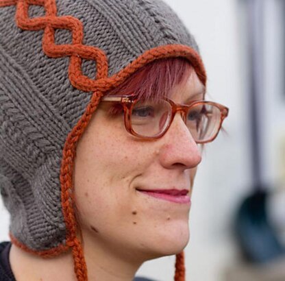 This top down earflap hat incorporates cozy cables and a tight gauge for an incredibly warm winter hat. Four large cables line the hat, broken up by knit panels with thin braids of mini cables down the center. These two sections give enough to hold the interest of the knitter without the end result becoming too busy. The thing that sets this hat apart is the contrasting color cable and edging. The cable splits at the bottom of the hat, becoming the edging and ties.