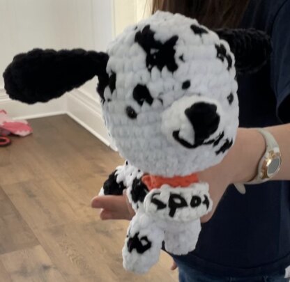 This dalamatian stands about 4.5"/11cm tall. Results will vary depending on your tension and your yarn & hook choice.