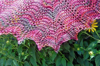 Hand-painted yarn and the traditional Feather and Fan lace pattern combine to create this triangular shawl. Knit from the neck edge down, increases are made every other row to shape the shawl while borders are knit in garter stitch. By increasing the needle size, twice, as the shawl is worked, the lace patterning enlarges. Final edging is a set of simple crochet loops.