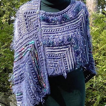 A carefree poncho with an asymmetrical close… or a sassy shawlette? Buttons give you two ways to enjoy your creative artwear.