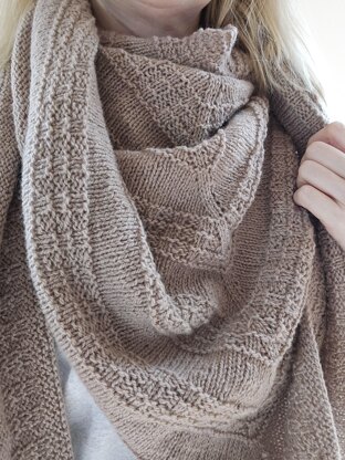 The Dancing Dices shawl is a simple, symmetrical triangle shawl featuring regular increases on both edges and along the center. The shawl's checkered pattern uses only knits and purls, making it an ideal project for beginners.