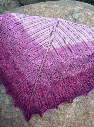 I really enjoy knitting a shawl that has a relaxing rhythm with a simple lace pattern. With this in mind, I designed Dancing Embers. This pattern features a top down triangular shawl started with a garter tab cast-on. A triangle is constructed on each side of the shawl separated by a stockinette center stitch. The design starts out with a simple lace pattern with optional beading that looks more intricate as the shawl grows. This pattern can easily be modified to use more yardage of a gradient skein of yarn.
