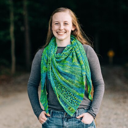 This knit is a fun, addicting asymmetrical triangle that is easily memorized and customizable. It is written for one 2 Mile Series skein of fingering weight yarn, which creates a lightweight shawl with a lot of drape. However, feel free to make this pattern yours by using the yarn weight and color schemes that you love! It would look beautiful in a solid, tonal, speckled, faded, or multi-color scheme.