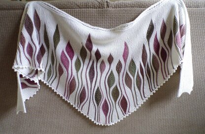 The crescent shape shawl has a decorative 8 st., 2 row repeat lace pattern on the straight top edge. 2 leaf shapes, 5 leaf sizes. Lower edge gains it shapw from 1 inc/dec every 4th row. The crocheted picot edge is added after shawl is knit.