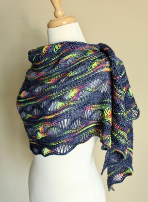 This lovely hand dyed yarn beautifully captures the colours of the northern lights dancing against a dark sky. With a simple combination of garter stitch and yarn overs these pretty colours get to dance across the dark background of this easy crescent-shaped shawl. It is worked from the top down with only knit stitches, yarn overs, and increase stitches, making it a quick and easy project. Choose a hand-dyed or hand-painted colourful yarn in fingering weight. Yarn shown here is Hilori's Magical Yarnorium Meri Jane in the limited edition prismatic colourway 'The Sky's Awake.'