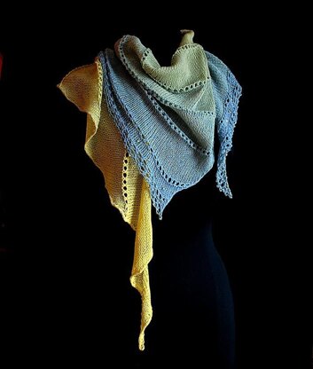 Small Version: 1 skein (246yds) Shibui Knits Linen suggested. Large Version: Double Stranded~Habu Textiles A-148 1/17.6 Wool Stainless Steel, held with 2 ply Lace Merino. (Approx. 300yds used) Larger Version~(Not HUGE) Wolles Yarn Creations Color Changing Yarn~ (Approx. 460-480 yds used).