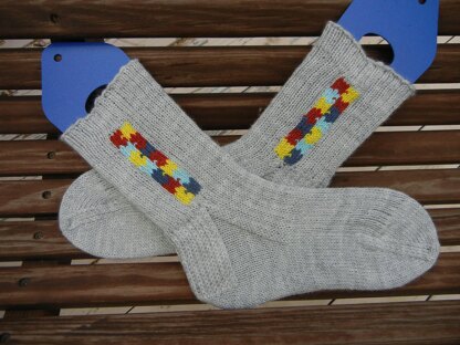 This is a traditional cuff-down sock with a heel flap and gusset. The jigsaw puzzle pattern is added with duplicate stitch after the leg is knit.