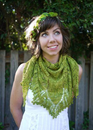 A beautiful and lacey shawlette worked at a loose gauge for a wonderful drape. Named for the Daphnaie, nymphs of the laurel tree, in Greek Mythology. Varying lace and leaf patterns echo the forest where the nymphs dance around their trees and the leaves they adorn themselves with.