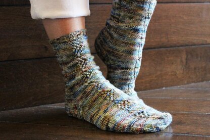 I love designing socks with handpainted yarn; the challenges of preventing pooling while bringing out the beauty of the yarn pushes me to try new techniques and patterns. For these socks I wanted to use reverse stockinette stitch to spread out the speckling of the lovely Phydeaux Designs yarn, but a whole sock of purling was just too basic for this yarn.