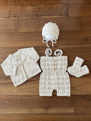 A great little set for spring / summer. Knitted mainly in st st with a picot edge and simple memorable lace stitch.