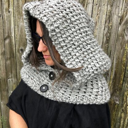 Using a simple two round repeat, this hooded cowl creates a beautiful and interesting texture. The woven quality gives unique visual interest. The generous sized hood is sure to keep your entire head safe no matter what the weather.