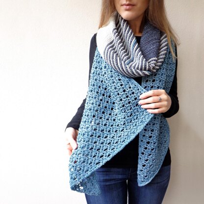 Beautiful lace, garter stitch and stripes play together to create this eyecatching, warm & cosy wrap.