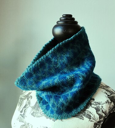 Originally designed for the Yarningham 2018 brochure, now available as a download. The cowl may be worked as a DK-weight version (in cobalt/turquoise) using WYS Wensleydale Gems, which is reminiscent of the colours of typical De Morgan Persianware, or as an aran-weight version using Rowan Kid Classic (cream/turquoise version).