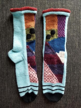 This pattern is toe-up, uses a short row Sherman Heel, and incorporates the colorwork techniques intarsia-in-the-round (“Annetarsia”), stranding, and duplicate stitch. There are links to tutorials for the heel, Annetarsia, and duplicate stitching in the pattern.