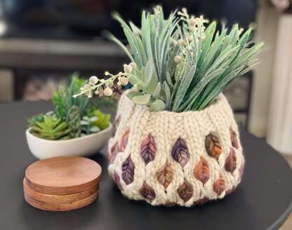 Deciduous is a very chunky, textured, rustic, yarn bowl/ decorator basket featuring autumnal leaves