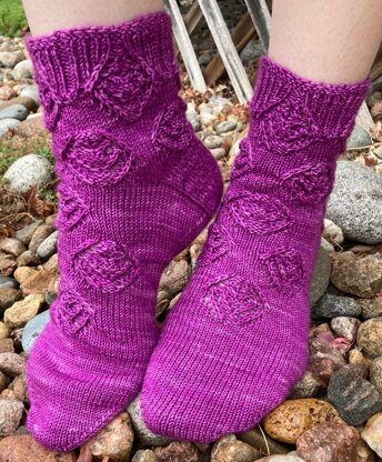 Lacy art deco diamonds for an ankle sock with 1920's style. Slipped stitches elongate the lines of the diamonds, set off by reverse stockinette.