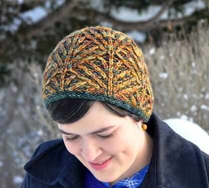 Deco Fans is inspired by classic art deco wallpaper. Although the stitch pattern looks complex, it features a combination of slipped stitches and simple cabling so colors are worked one at a time. Worked in two colors, the slipped stitches of this pattern provides a great opportunity to pair a semisolid colorway with a highly variegated colorway, or stick with two semisolids for a bold, graphic design.