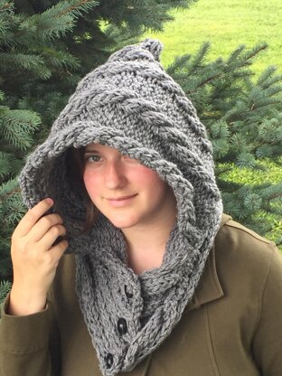 This hooded cowl gives a flavor of the elven woodlands as well as an Irish flare, and is definitely one of my favorite designs so far. It is very easy to make, even beginners to cables will find this project simple to make. 2.5 skeins of Red Heart Super Saver Grey Heather were used for this project. Sewing needle and cable needle is needed for this project.