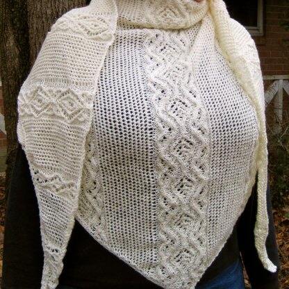 This lightweight triangular shawl incorporates 4 distinct cables, any one of which could be used by itself in another FO. Each cable is a slightly different width, and is quite unique. There is a unique mesh stitch between the cables.