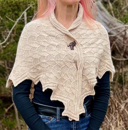 Did you ever have a couple of skeins hanging around after a project and wondered what to do with them? This shawl answers that question. It can be worked in any yarn and be as big or as small as you like. The stitch pattern is reminiscent of a dragon's scales or falling leaves and provides gentle texture. Ribbed edging and mitred corners allow the shawl to lay flat. We work from the narrowest point out and up so you can stop when you either run out of yarn or it's as big as you like!