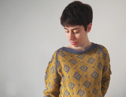 This raglan sweater inspired by byzantine mosaic is worked from the bottom up in the round. with an all-over stranded pattern worked in two colors. The sleeves are worked separately in the round and joined to the body at underarm. The yoke is worked in the round with raglan decreases and ends with a wide boat neck.