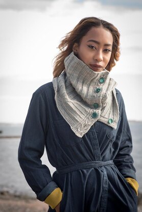 Desolation Sound’s shifting textures and geometric lines evoke mountains rising from the sea. The widening rib section shapes this deep cowl, giving it a narrower top that hugs the neck. Reversible cables act as buttonholes, allowing you to decide where to place your buttons—and how many to use—when the piece is done. These cables combine with the ribbing to make an edge that looks as good folded back as it does buttoned up. Desolation Sound is worked flat in one piece, using knit, purl, decreases, yarn overs, and 4-stitch cables. Instructions are both written and charted.