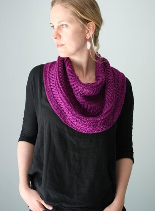 Dewberry is a sweet and simple single-skein shawl-cowl hybrid. Designed to use up a small amount of worsted or aran weight yarn, this piece is shaped like a semi-circular shawl but is worked mostly in the round to resemble the look of a small shawl worn wrapped around the neck. Dewberry utilizes purled stripes and the simplest of lace patterns to give it texture and interest. It comes in two sizes and can also easily be enlarged by using a heavier weight of yarn. This cowl whips up in no time at all, so if the weather changes one morning and you find yourself needing something new to keep you warm, Dewberry will be ready for you by that afternoon.