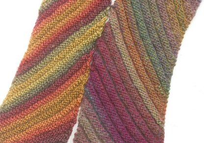 Try something different. This scarf is knit in diagonal "ribs" that is great for showing off the lovely color changing yarns. These yarns can block up and be hard to work into a straight scarf but this diagonal pattern works beautifully.